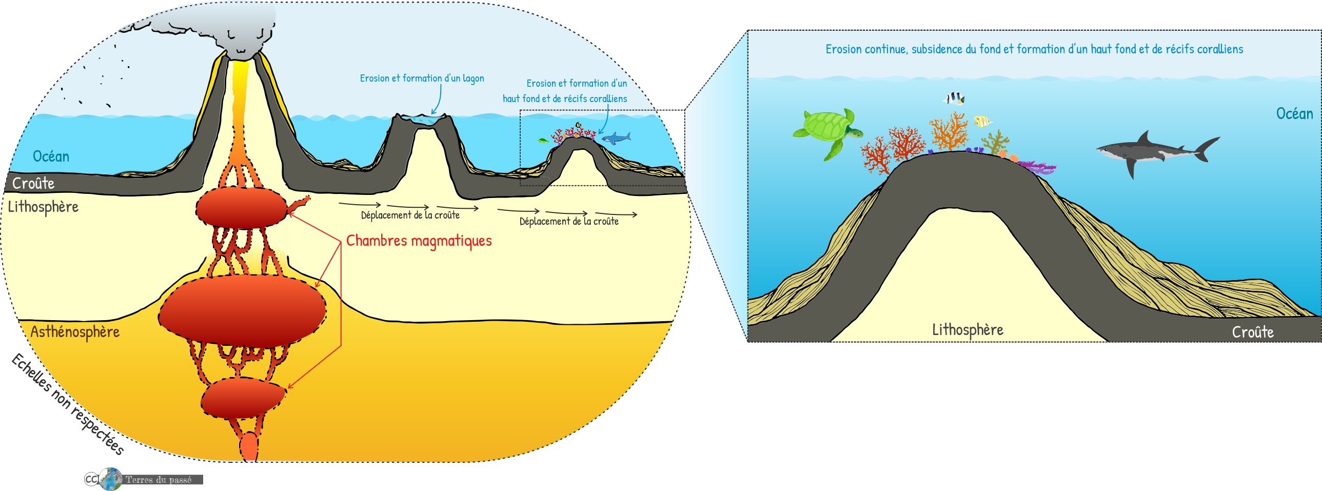 En vieillissant, la lithosphère se décale, s'épaissit et se refroidit. Lorsque le volcan formé s'est suffisamment déplacé et ne se trouve plus exactement au-dessus du point chaud, il s'éteint et un nouveau se crée au-dessus du point chaud. En continuant de s'éloigner, le volcan s'érode et la lithosphère océanique s'enfonce peu à peu, ce qui submerge partiellement le volcan éteint qui devient un atoll.