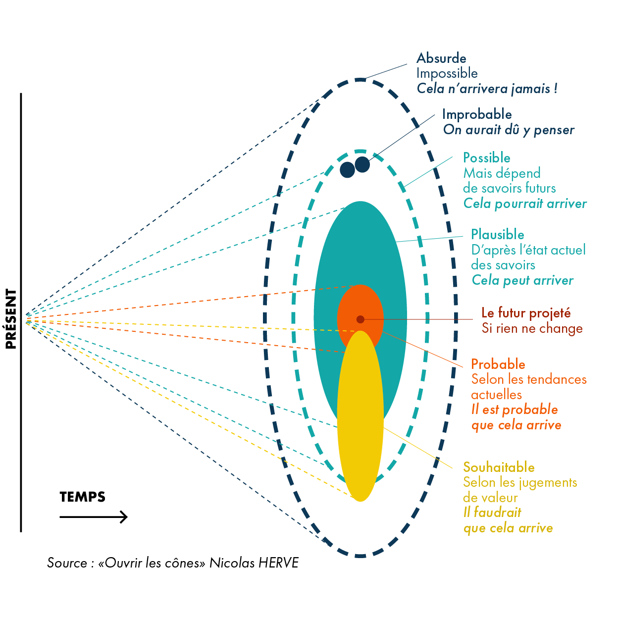 - Le futur souhaitable : il faudrait que ce futur se produise, à l'intermédiaire entre les futurs probable, plausible et possible.