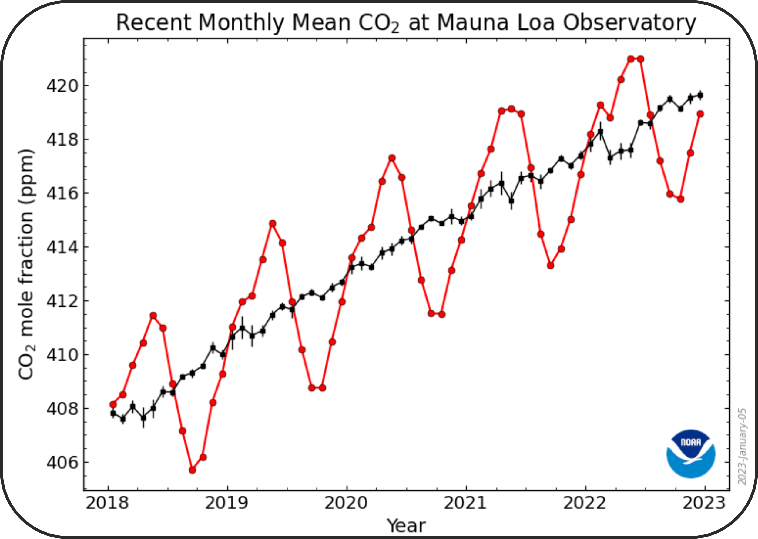 La courbe rouge présente des vagues correspondant en fait à l'augmentation de la consommation du CO2 atmosphérique durant le printemps, avec les blooms phytoplanctoniques, puis à l'hiver, avec la dominance de la consommation de matière organique par les organismes hétérotrophes et donc le relargage de CO2.