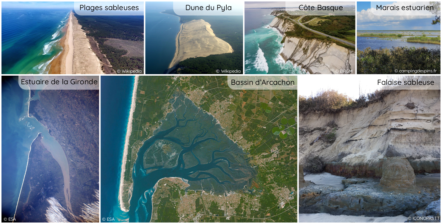 En Nouvelle-Aquitaine, une grande diversité de milieux existe : de longues plages sableuses (comme les plages des Landes et de Gironde), des dunes côtières (comme la Dune de Pyla, particulièrement remarquable), des côtes rocheuses (comme dans le Pays Basque), des zones estuariennes (comme l'estuaire de la Gironde), une lagune (le Bassin d'Arcachon), des marais, des falaises ou encore des zones humides.
