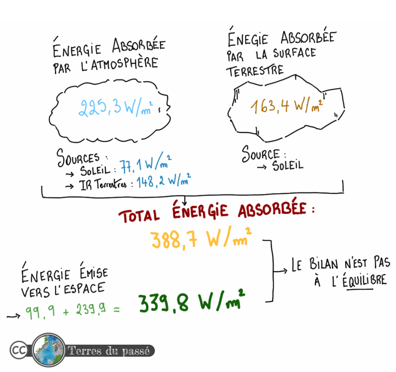 Si nous devions nous limiter à ces deux facteurs, le bilan énergétique de la Terre ne serait pas à l'équilibre : pour 163,4 W/m² d'énergie reçue, la Terre renvoie 239,9 W/m². Or, si l’énergie sortante est supérieure à l’énergie entrante, la Terre se refroidit.
