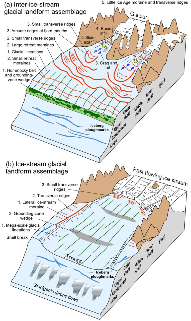 Ils ont également distingué des assemblages de landforms typiques des icestreams et d'autres typiques des zones inter-icestreams.